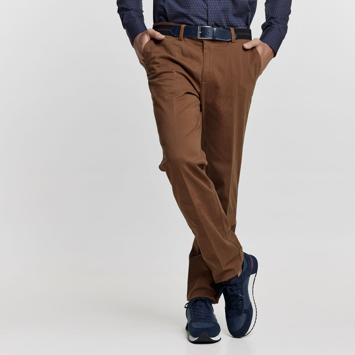Το παντελόνι διαθέτει χακί ζώνη με μια διακριτική λαδί γραμμή και καφέ δέρμα στο τελείωμα, που δημιουργεί μία σικάτη διχρωμία. Η regular fit γραμμή, με ίδια σιλουέτα από τη μέση έως τον αστράγαλο, προσφέρει μία κλασική εφαρμογή που παραμένει διαχρονική.