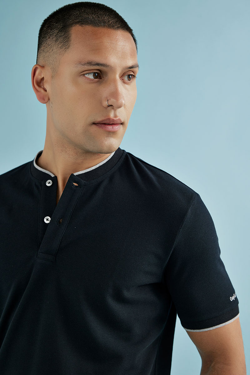 Guy Laroche Βαμβακερή Κοντομάνικη Μπλούζα με Γιακά Μαο σε Μαύρο Χρώμα