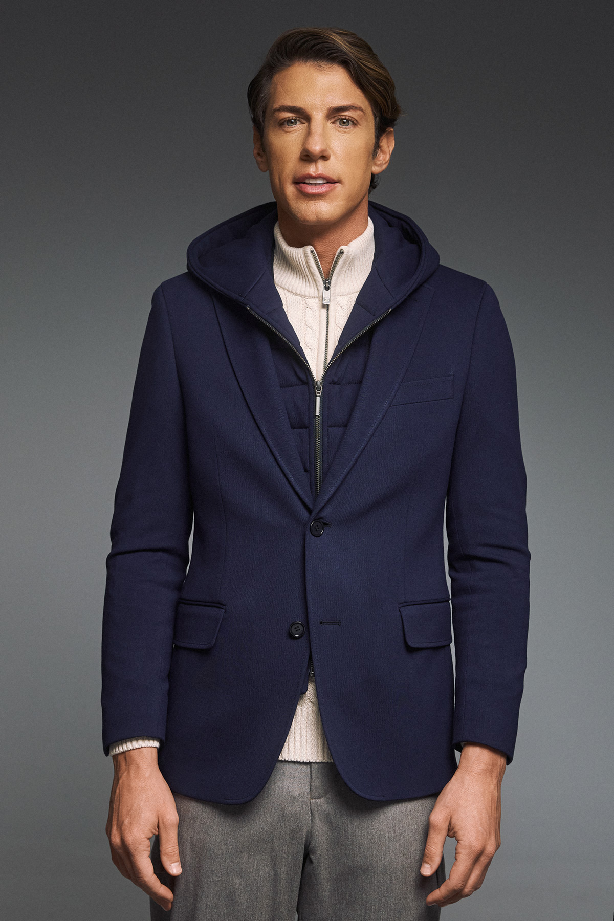 Σακάκι Γιλεκούχο με Κουκούλα του οίκου Guy Laroche σε Μπλε χρώμα, που θα γίνει ο απόλυτος στυλιστικός σας σύμμαχος σε κάθε καιρική συνθήκη. Το πέτο του έχει, ενώ διαθέτει 2 τσέπες που κλείνουν με flap κλείσιμο και αποσπώμενο Κυπαρισσή γιλέκο. Η μικρή τσέπη για το μαντήλι πάνω αριστερά ολοκληρώνει την εικόνα, ενώ η πολυτελής φόδρα αποτελεί μία ακόμα εκλεπτυσμένη λεπτομέρεια.